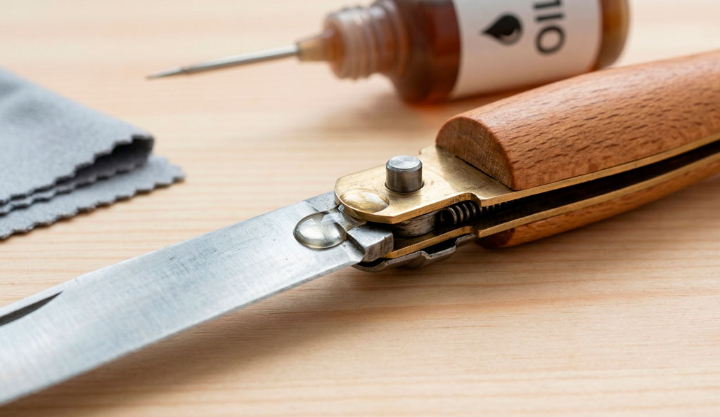 La lubricación no solo facilita el uso de la navaja, sino que también protege el metal de la oxidación. Recuerda que un mantenimiento regular también incluye esta práctica.