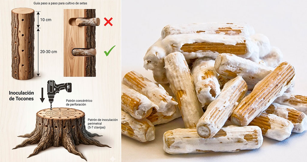 Si estás empezando, uno de los formatos más sencillos es el micelio inoculado en clavijas de madera (también conocido como micelio en pellet). Este sistema facilita mucho el proceso y reduce errores.