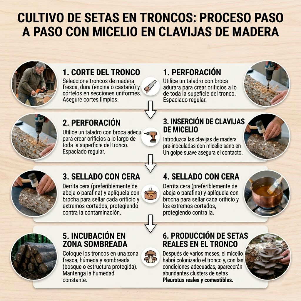 Contar con material de calidad facilita mucho el proceso. Si estás empezando, lo más sencillo es usar micelio en clavijas ya preparado, que puedes adquirir en La Casa de las Setas.