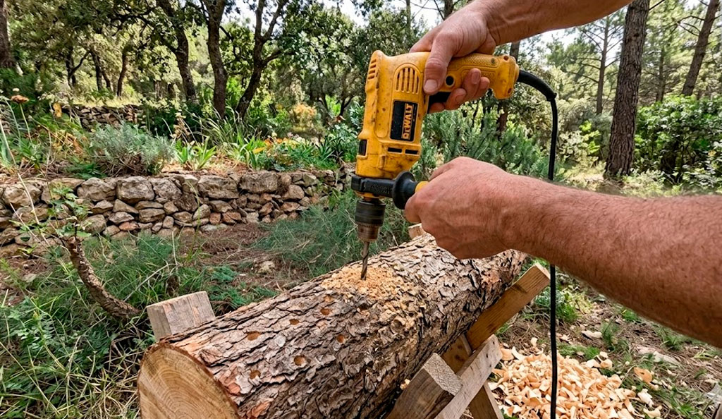 Además, asegúrate de contar con las herramientas necesarias, como un taladro, que será esencial para perforar los troncos.