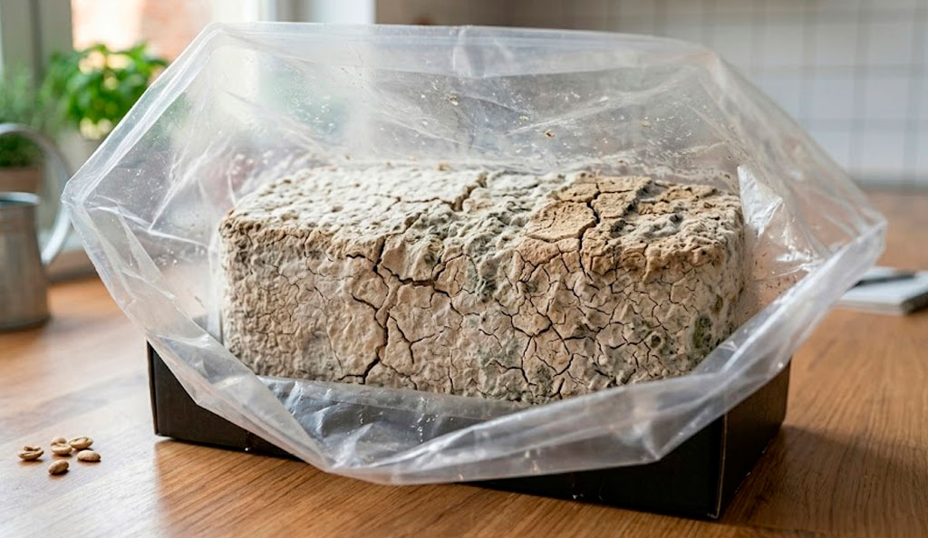 Si observas manchas inusuales en tu sustrato, es probable que haya contaminación. En este caso, es mejor desechar el kit y empezar de nuevo. Las soluciones para un pan de setas contaminado son muy limitadas, y es preferible prevenir que lamentar.