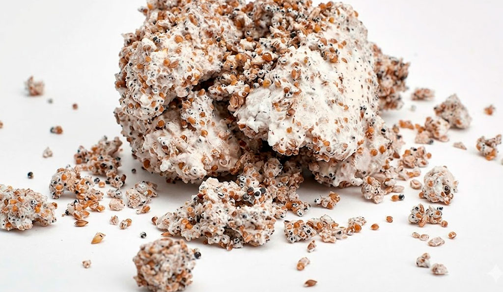 Se trata de granos (como trigo, centeno o mijo) completamente colonizados por el micelio de la seta. El micelio es la parte vegetativa del hongo, una red de filamentos blancos que, en condiciones adecuadas, dará lugar a las setas.